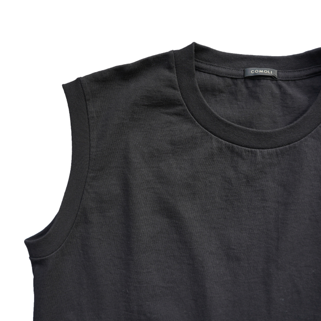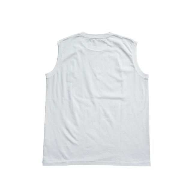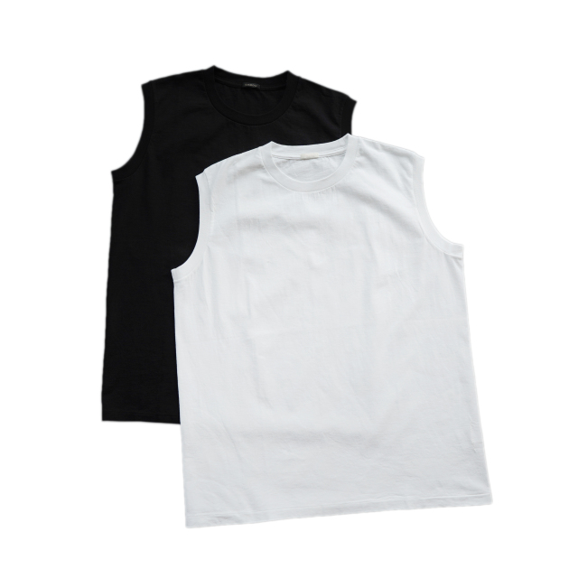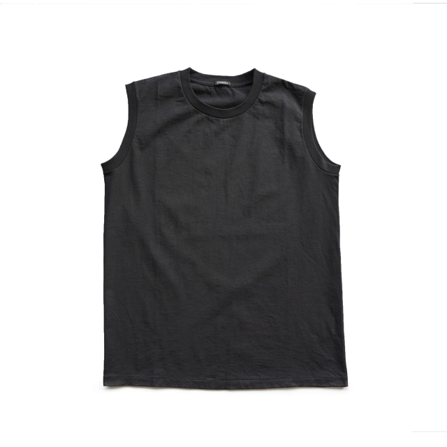 丸胴ボディに、裾は天地引き、アームホールはリブ仕様と、しっかり作り込まれたノースリーブ。