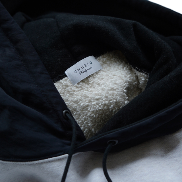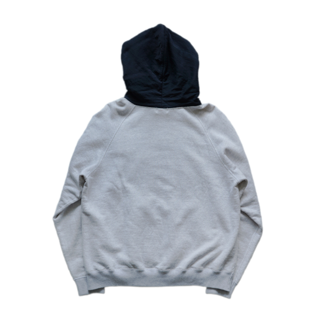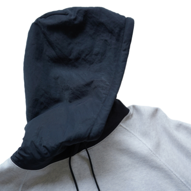 ぱっと目を惹くフード部分は、シワ感のあるナイロンツイル。