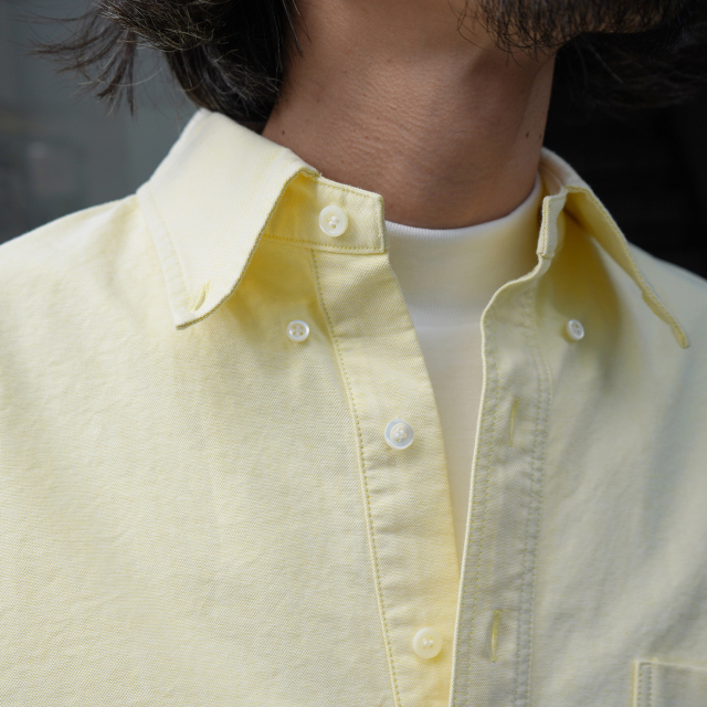 身幅、アームホールの広さ、ヨークの位置など部分ごとのディテールをオーバーサイズに設定していますが、全体としては縦長のバランスに仕上げることで、過度に幅広に見えないロングスリーブのプルオーバーBDシャツに落とし込んだ一着。