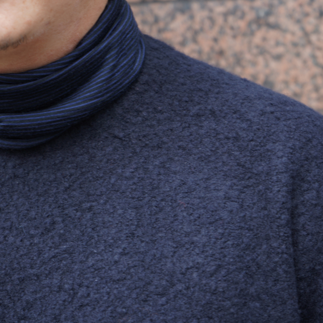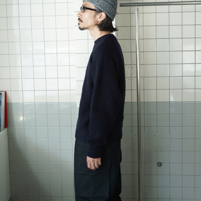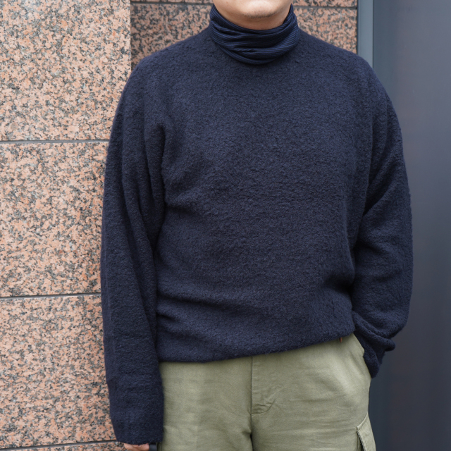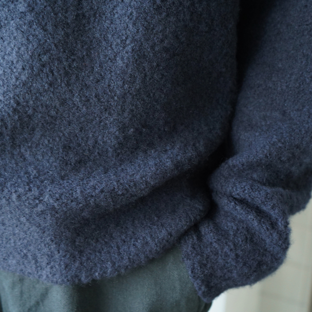 カシミヤをはじめとする高品質なテキスタイルを生産する、イタリアのBIAGIOLI MODESTO社のカシミアブークレヤーンを使用したクルーネックニット。