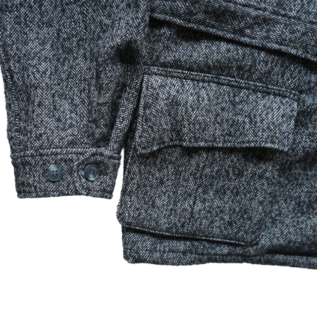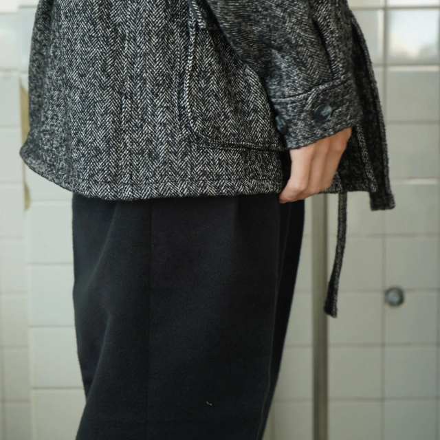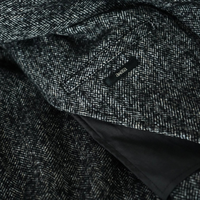 一見、グレーベースのヘリンボーン地ですけど、よく見ると金や銀の糸が混ざってて、ちゃんとファンシーしてます。でもギラつかず、光の加減でほんの少し表情が出るくらい。