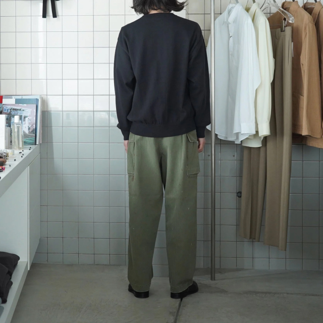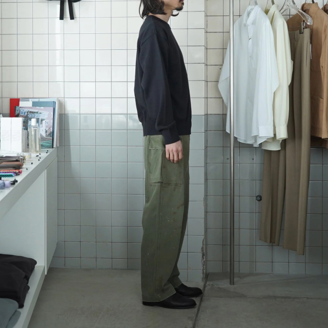 シルエットは、腿周りに余裕を持たせつつ、裾にかけて緩やかにテーパード、太さはありながらも野暮ったくならず、HERILLらしい“きれいなミリタリー”を体現しています。